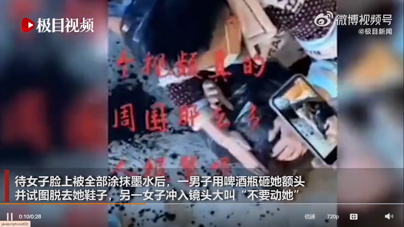 视频显示,陈女被透明胶带捆绑,徐男和另一名男子则将其压制在地,不断泼洒墨水在她身上。徐男甚至还用疑似啤酒罐大力敲打陈女额头,并试图脱去她鞋子,另一女子冲入镜头大叫“不要动她”,但陈女仍被按压在地殴打。