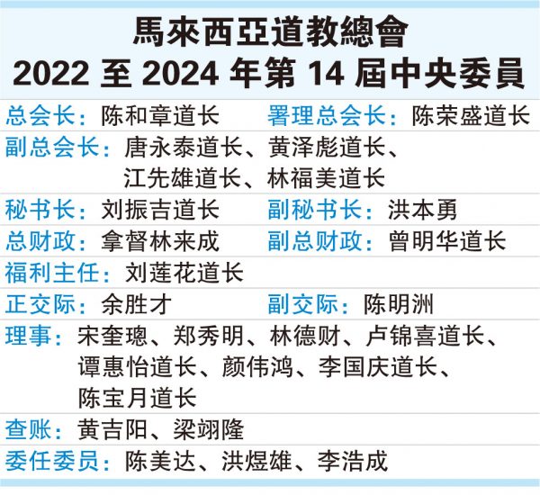 (吉隆坡7日讯)马来西亚道教总会召开2022年度全国代表大会并改选新届理事会,陈和章蝉联总会长,其他各主要职位均获得蝉联。