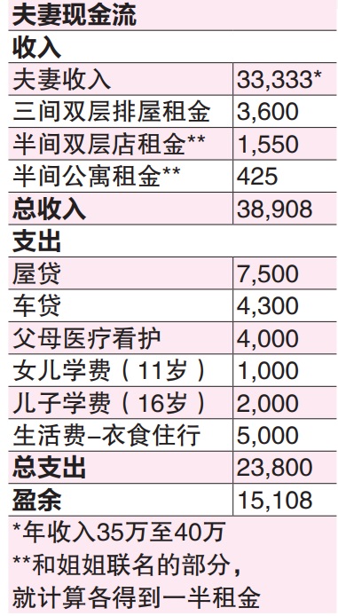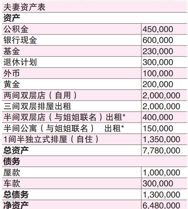 如果把资产中的现金、公积金、黄金、外币来凑合1300万令吉还清所有债务,那么,你们的每个月开销大约1万2000令吉,如果再扣除所有租金收入,你的开销每月大约6425令吉。以每个月6425令吉退休资金缺口来计算退休所需,大概308万8422令吉(30年的退休和3%通货膨胀)。