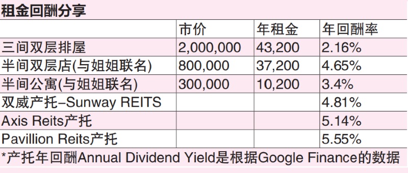 在分析你的租金回酬的方面,与姐姐联名的半间双层店,租出不错的回酬4.65%,我特地把3个大马出名产托回酬让你比较参考,可以慢慢考虑把手上,自己管理的房地产卖了,然后转入产托,由专人管理,每年或半年,只管收比定存高的利息就行了。