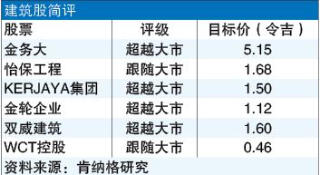 分析员说,目前为止,肯纳格研究所检视的股只,KERJAYA集团(KERJAYA,7161,主板建筑组) 、怡保工程(IJM,3336,主板建筑组)和金轮企业(KIMLUN,5171,主板建筑组), 已在槟城和马六甲获得了相关的建筑工程合约。双威建筑(SUNCON,5263,主板建筑组)则积极竞标。
