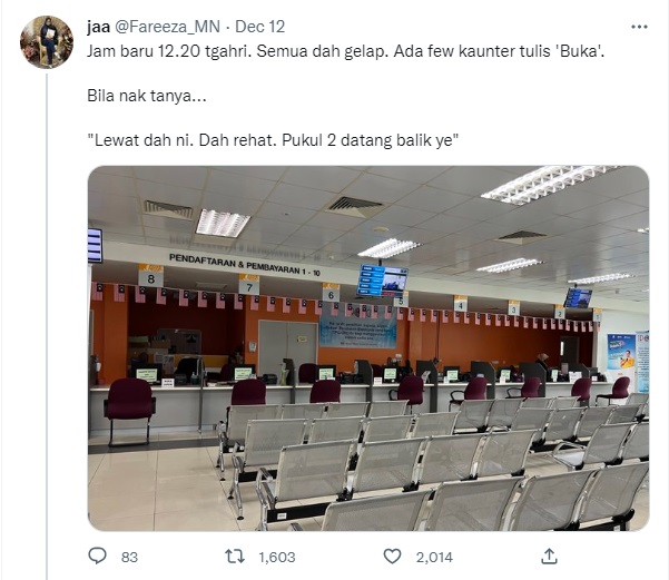 网民法丽扎在推特发文指出,她到政府医院时才中午12时20分,病人登记柜台上就已经没人工作,但有数个柜台却还摆着“开放”的牌子,让她忍不住上前询问医院的工作人员。