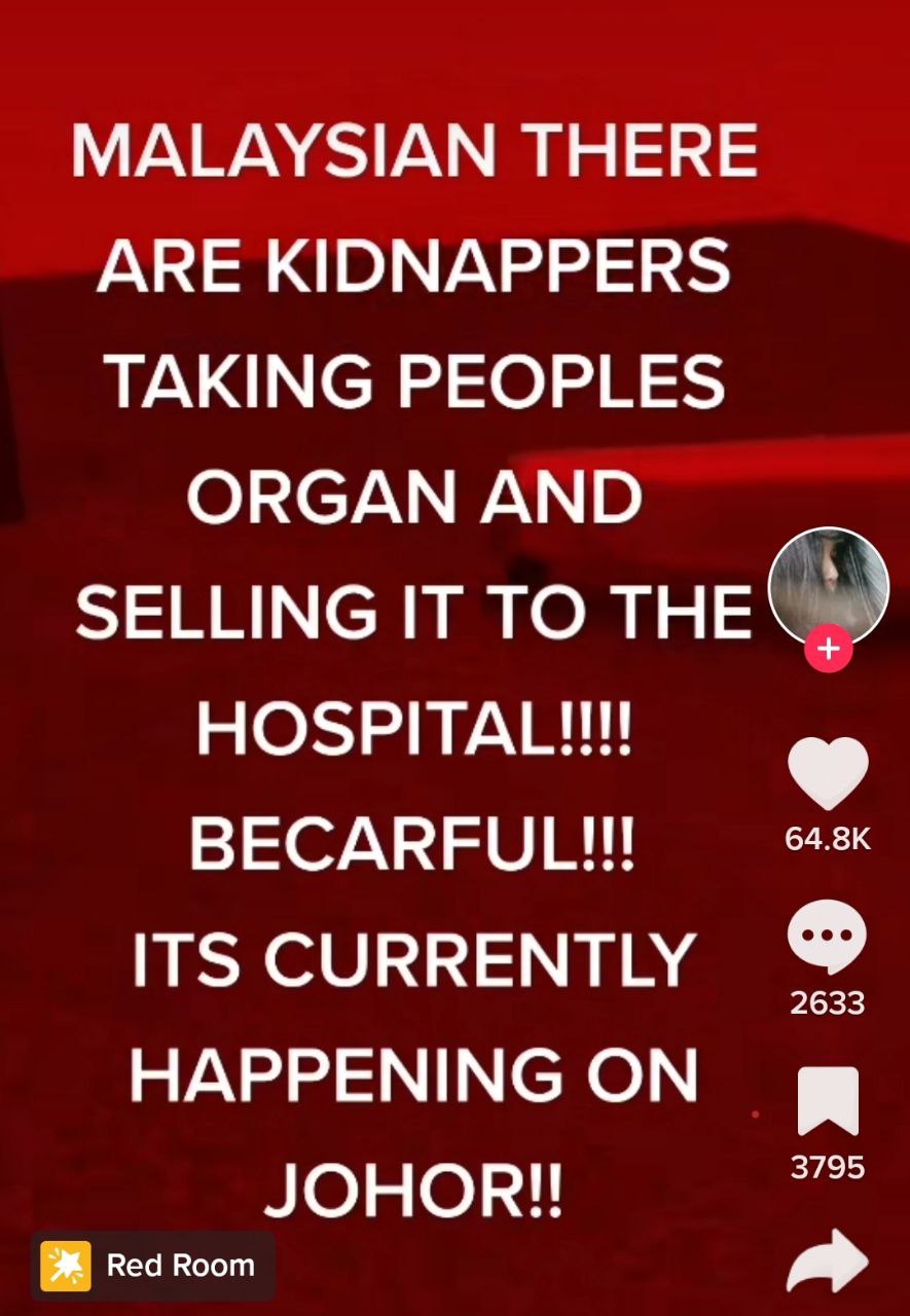 新山南区警区主任拉勿发文告表示,警方于本月11日凌晨12时27分接获投报称,社交媒体“Aestheticharu”的账号上传了一段11秒钟的抖音视频,视频内容具污蔑,宣称发生了绑匪掳人并将人体器官贩卖给医院的活动,这类事件也发生在柔佛州。