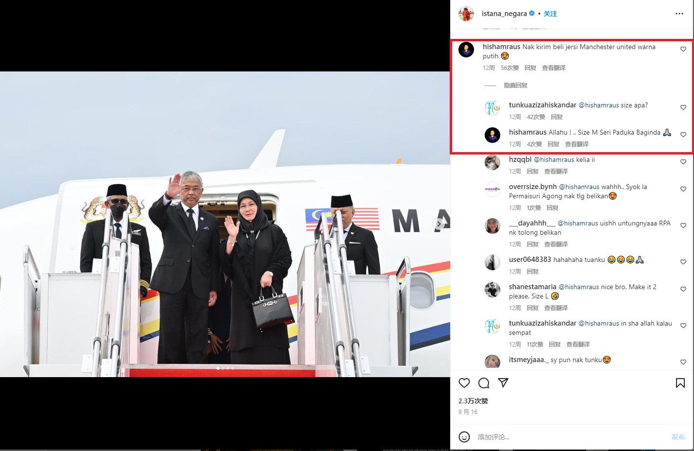 (八打灵再也13日讯)一名网民早前趁着国家元首苏丹阿都拉陛下与元首后东姑阿兹莎阿米娜前往英国伦敦时,打趣地在国家王宫Instagram留言表示想要一件曼联球衣,不曾想元首后竟然亲自留言“你穿什么尺码”,还真的把球衣送给他!