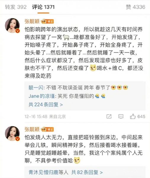 张靓颖昨午发文:“我不知道这么说好不好,但是吧,阳一天算阳过么了?”还在留言区回应:“怕影响跨年的演出状态,所以就趁这几天有时间养病去探望了一窝羊(阳)。”她透露染疫后全身各处痛,“然后睡了一天一夜,然后什么症状都没有了”,随后发现湿疹好多了,皮肤也不干了,然后还变瘦,期间只是喝水、吃维他命C,都还没来得及吃药。如今,她在评论区里的留言已被删除。