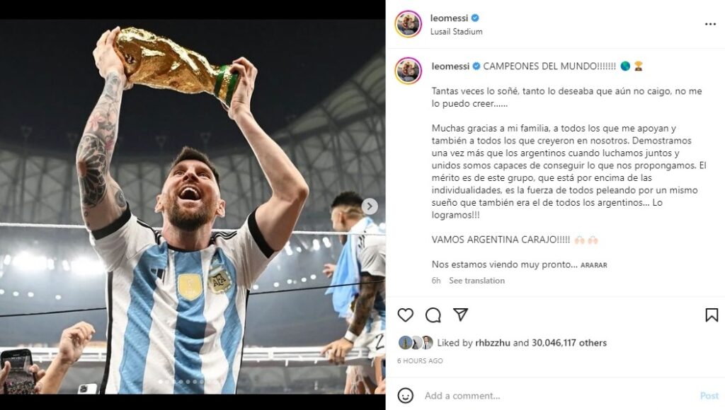 不仅仅如此,无论是举着大力神杯,还是回到阿根廷受到国民热烈迎接时,大众目光都是聚焦在梅西身上。就连他的社交媒体IG夺冠文更是破了最快千万点赞纪录。总而言之,他实实在在成为了当之无愧的一代球王,足以媲美前代球王马拉多纳。