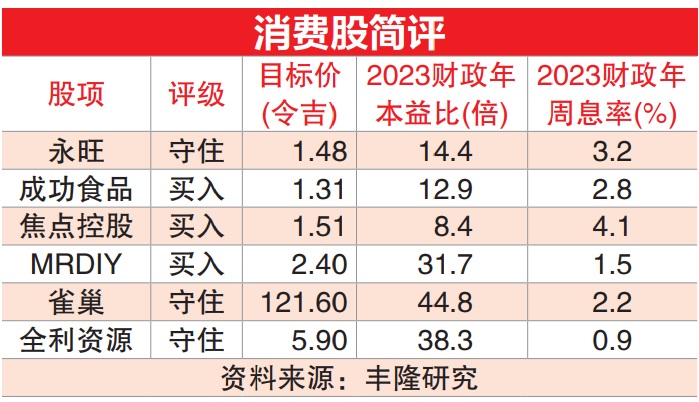 分析员也提醒,消费领域仍有挑战,因为消费者情绪疲弱、报复性消费已回复正常、经济衰退风险及通胀率冲击实际收入,都抑制该领域的前景。