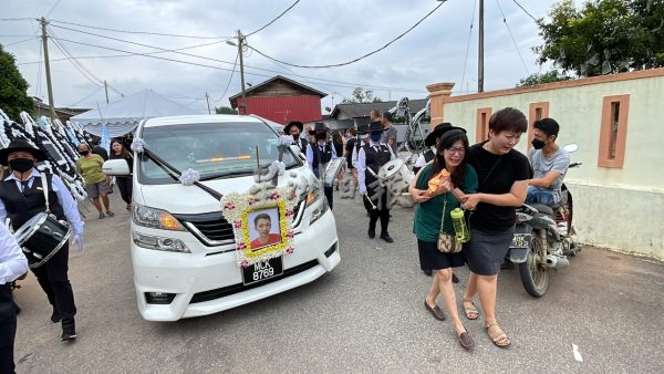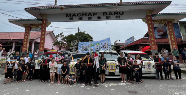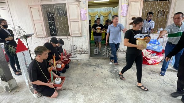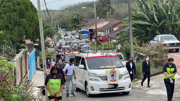 较早前在祭奠仪式环节,来自各地的亲友、村民、同学、学校师生及地方组织等,轮流到灵前拜祭致哀;马接峇鲁红新月会龙狮团在灵前击哀鼓,希望往生者一路走好。