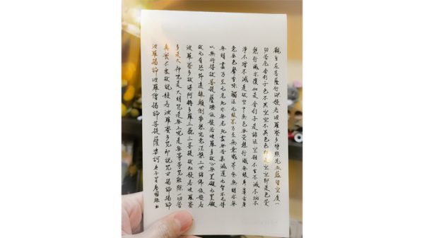 我虽从年少时就能背诵心经,但对其内容却一知半解。疫情期间的多次抄经,让我对这短短的260字经文有了更深的体会和领悟。世事纷扰、人间失序,然而此刻的我已不再慌乱,心无挂碍故无有恐怖。对于经文的领悟也让我在努力做好份内工作和照顾家人健康之际,也对社会和弱势群体付出更多关怀。