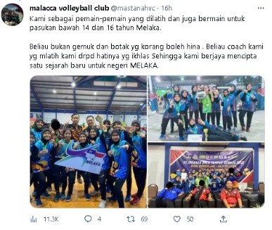 “我们作为代表马六甲的14名16岁队员,他不是你们可以羞辱的胖与光头,他是用真心在指导我们的教练,让我们成功为马六甲州缔造历史。”