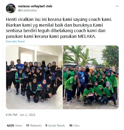 (八打灵再也3日讯)马六甲排球队捍卫教练,促请民众停止评论教练掌掴14岁以下队员的事件,并表示:“我们爱我们的教练,我们是一家人!”