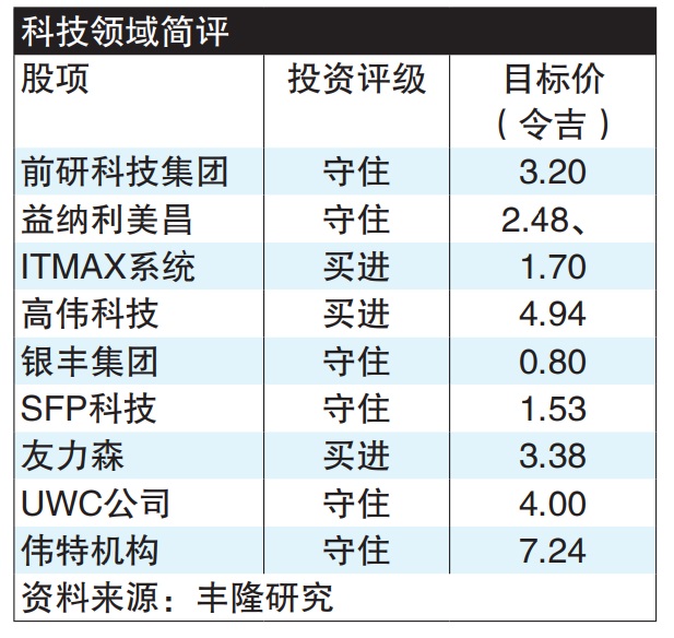 惟若还想在科技领域寻宝,丰隆研究首选为新去年中刚登场马股的ITMAX系统(ITMAX,5309,主板科技组),目标价1令吉70仙,看好该公司智能城市综合系统及方案业务,另一方面基于上升空间有限,下修前研科技集团(FRONTKN,0128,主板科技组)投资评级至“守住”,目标价3令吉20仙。
