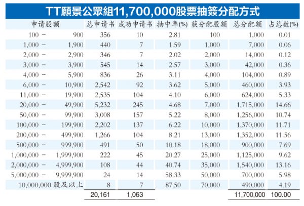 根据文告,准备1月18日在马股创业板上市的TT愿景控股,共收到大马公众2万1796份申请书,涉及21亿零956万2900股,金额高达7亿1725万1386令吉。当中,供土著认购的部份接获1万1224份申请书,涉及7亿7454万6200股,超额认购65.20倍;其余1万零572份公众申请则涉及13亿3501万6700股,超额认购113.10倍。