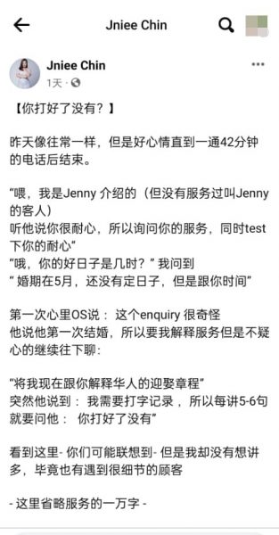 事主程小姐(婚庆主持人)接受《星洲日报》访问时透露,她于周二下午接到脸书的信息来电,接通电话后男子声称将在近日结婚,曾在其他婚礼场合见过事主,为此希望事主提供主持配套的细节,更要求事主配合他的要求,以当作是考验。