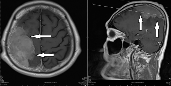 长在右脑上端顶部的脑膜瘤(箭头处),影响了左侧身体的活动。