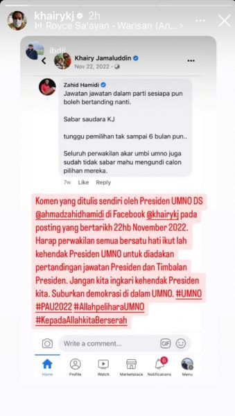 巫统在第15届全国大选遭遇重挫后,凯里曾与11月22日在脸书炮轰阿末扎希,要他下台后;扎希随即直接在其帖文留言:“耐心点,巫统党选6个月就要举行了!”