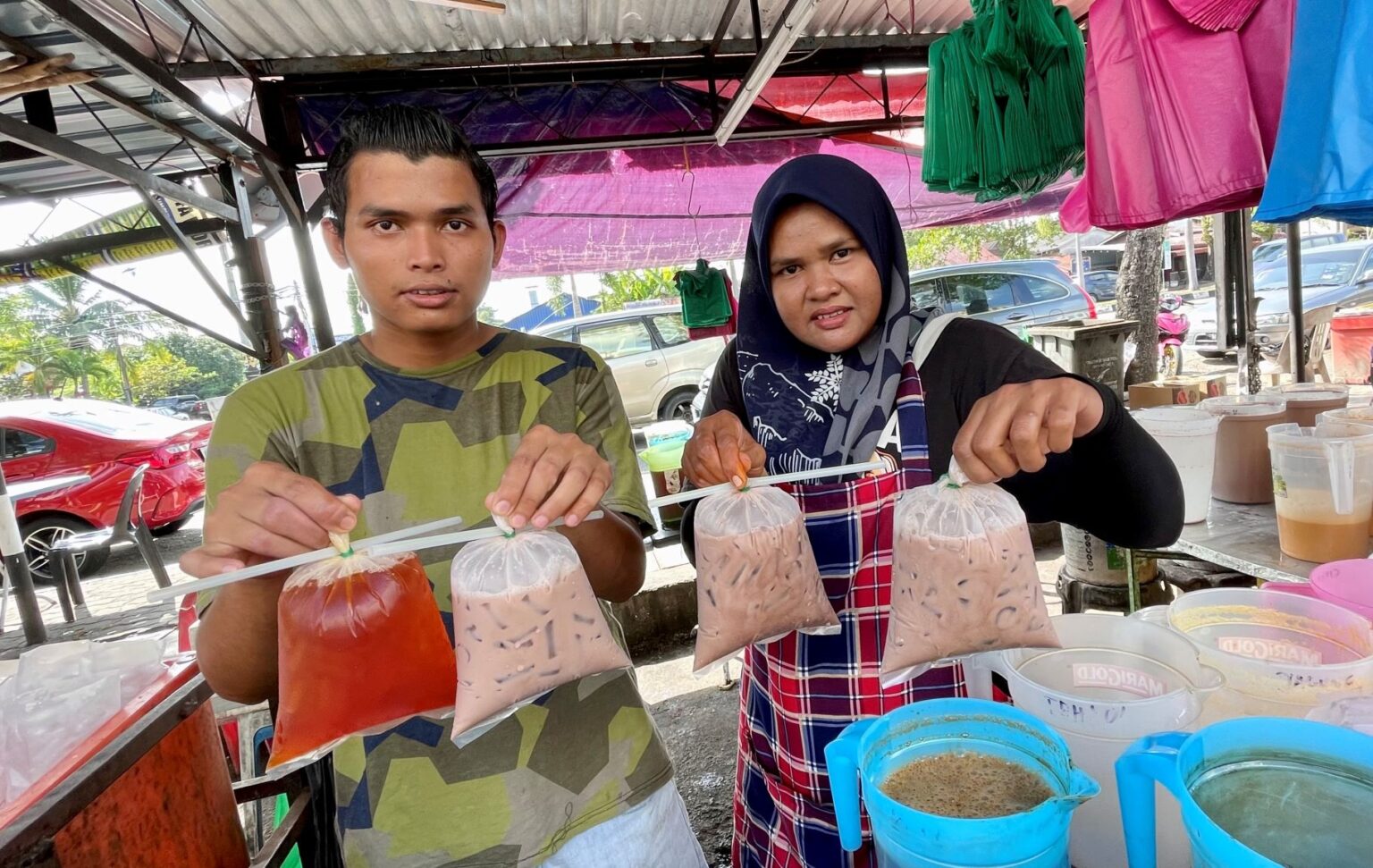 在吉打班台柔佛(Pantai Johor)卖包装饮料的小贩三苏丁阿末(57岁)说,尽管每包饮料只卖1令吉,他还是有赚。