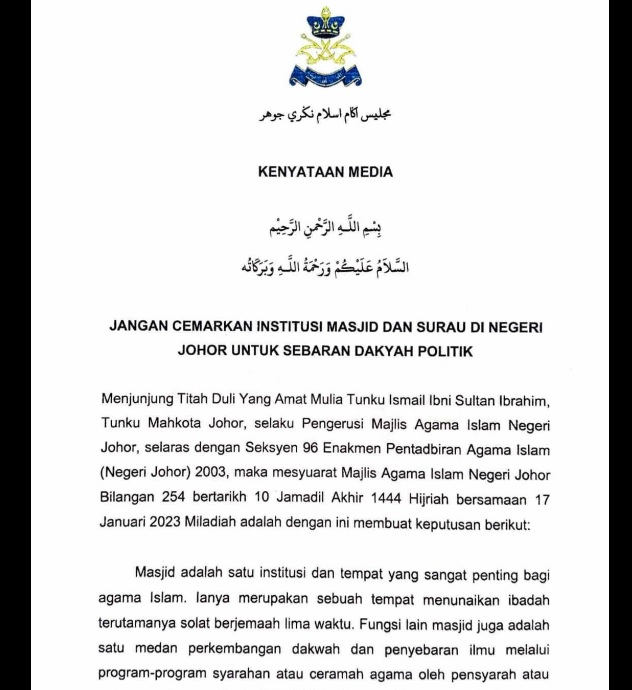 报道指出,柔佛苏丹依布拉欣陛下曾于2019年发文告提醒,柔佛州内所有清真寺或清真寺邻近范围都不允许发表演说,除非有关人士获得柔佛伊斯兰宗教理事会(MAINJ)的官方批准。