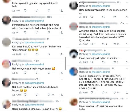网民过后在视频下留言讽刺“一年级至中五的英语白读了”、“她究竟明不明白‘使用在’的意思?为何看到‘猪’的字眼,就认为是成分?请看清楚才提醒大家。”;有网民说“她是认真的吗?还是开玩笑?”,另有网民指被女子的视频分享吓到,因为家里就有几瓶相同的调味料。