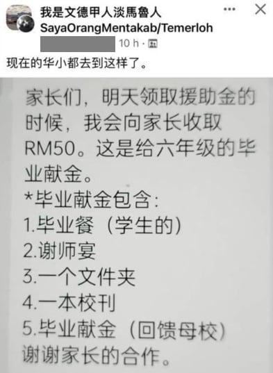截图显示,校方要家长来领取援助金时,支付50令吉的毕业献金。“家长们,明天领取援助金的时候,我会向家长收取50令吉。这是给六年级的毕业献金。”
