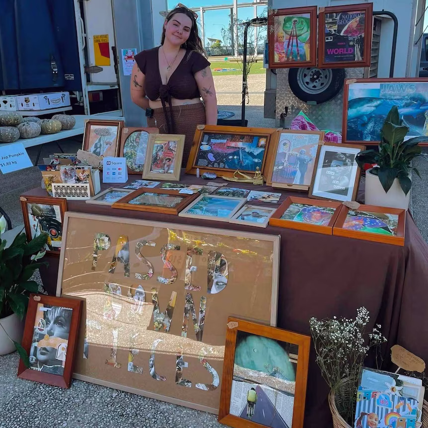 她从义卖店或二手商店中购买杂志和相框,然后在当地市场出售她的作品,并举办研讨会。