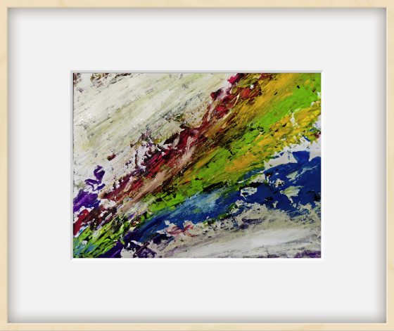 她用熨斗想把我复原,但皱皱的我还是留下了伤痕,她用不同的颜色沿着我身上的痕迹画出了很多线条,她眼中闪着光芒,不停地在我身上展示她的创意。一幅精心彩绘的抽象画完成了,我完全不认得自己了。我被女孩框起送到一个展览厅挂在墙上,我不再是一张白纸了。我是一张被扭曲后从12楼跃下,经历了痛苦也回复不了的抽象画。那个女孩为我命名为《重生》。以前我是一张白纸,但现在我叫重生。