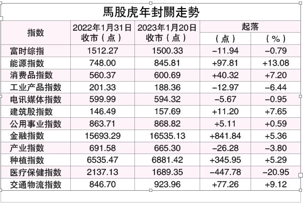 各大指数起落参半,当中能源股指数表现最佳,虎年劲涨97.81点或13.08%,报748.00点。其次则是交通物流股指数和建筑股指数,分别涨9.12%和7.65%。