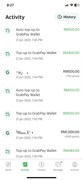 UltimateZai说,他的Grabpay电子钱包绑定了扣帐卡(Debit Card),遭骇客进行了数次充值后,同样转了1500令吉到与Zaim Fuzi被盗的同一个户头。