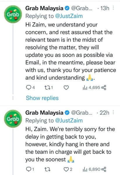 他在推特上标记Grab公司“@GrabMY”,并得到该公司的回复指,他们正在努力解决此事中。