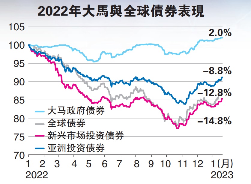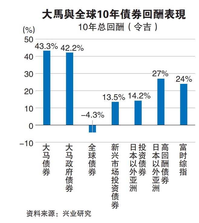 “从全球表现来看,大马债券的表现超越了全球债券、新兴市场投资债券、日本以外的亚洲投资债券及日本以外亚洲高回酬率债券,2013至2022到期的10年债券,大马债券指数的总回酬达到43.3%。”