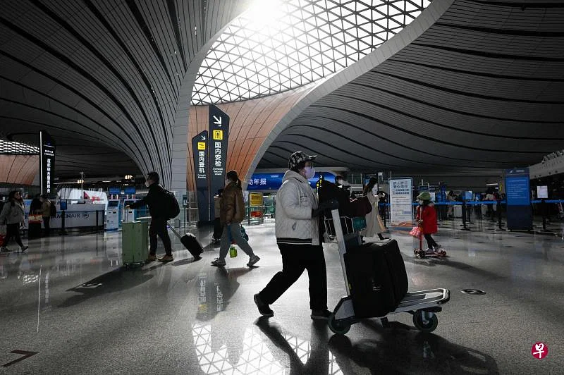彭博社报道,中国放宽防疫措施正加快中国富人外流速度。图为乘客1月19日在中国北京大兴国际机场准备办理登机手续。(图:法新社/联合早报)