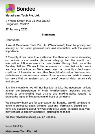 (八打灵再也28日讯)爆红应用程式Bondee被指盗取用户信息,使用户信用卡被盗刷,该母公司Metadream昨日发声明澄清,并不属实。