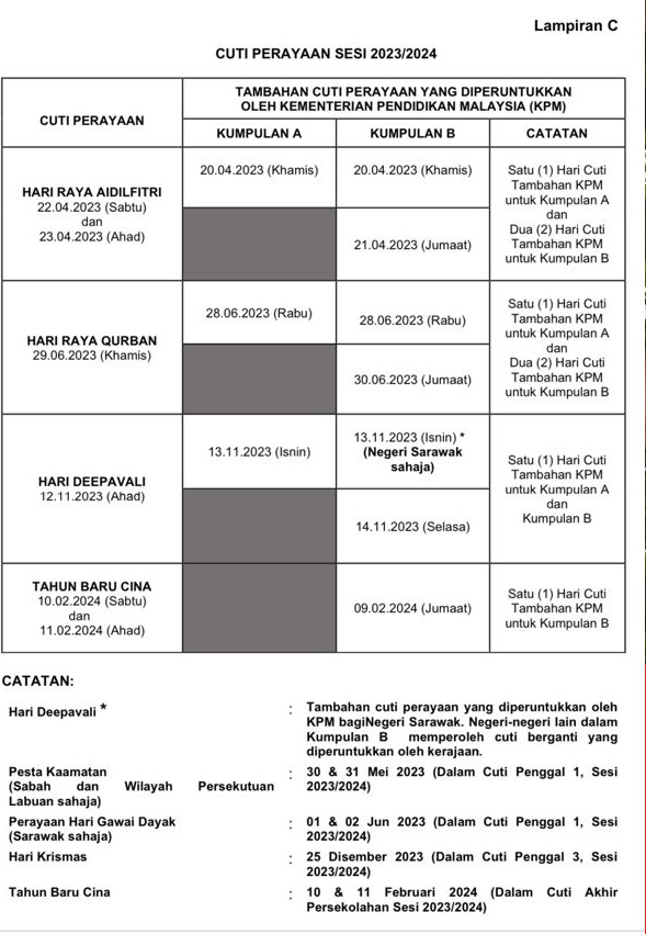 教育部的通告提到,由于明年的大年初一和初二分别落在周六和周日,B组学校获得一天的额外假期。