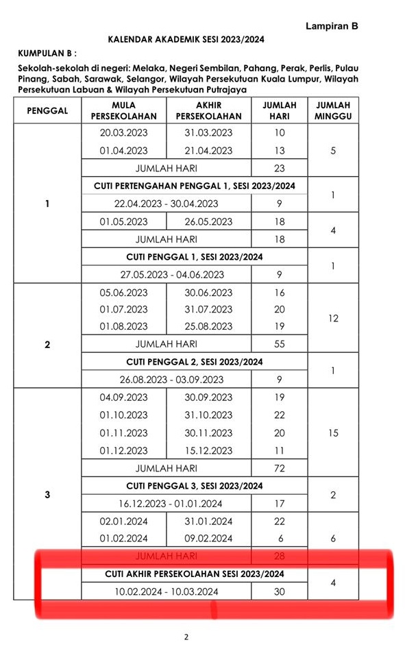 根据教育部2023/2024学年历的通告显示,A组学校将在2024年2月9日开始放假,至3月9日,B组学校的年终假期则从2月10日至3月10日,共计30天的学校假期。