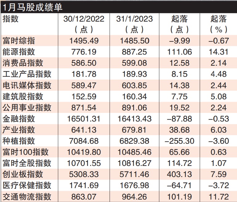 尽管综指按月下滑,但1月马股的15项主要指数,只有4个指数按月下跌,表现比12月差,其余11个指数表现超越综指。