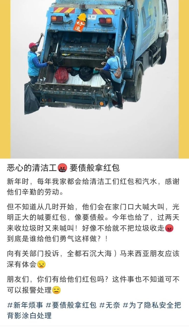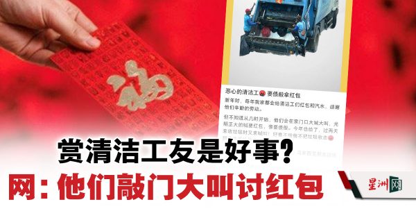 “朋友们,你们有给他们红包吗?这件事不知道可不可以报警处理?”他也在贴文下标签 #要债般讨红包、#新年烦事。网民留言指不妨向地方政府发展部投诉,也有网民标注了部长倪可敏,指收拾垃圾属地方政府,因此促请倪可敏关注清洁工友“理所当然”还大喊大叫讨债式要红包的行径。