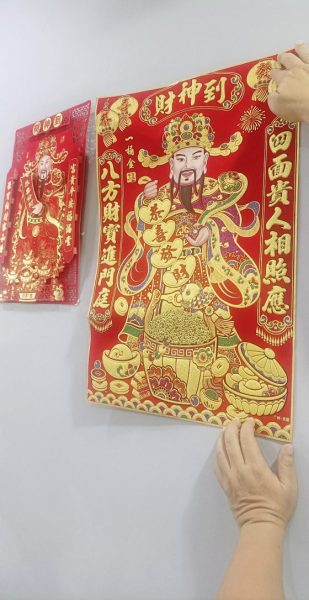 直到前年,我们家门前已没法挂上更大一号的黄梨灯笼。于是,我们转而在客厅墙上张贴财神爷的图案。今年的贴图要比上一年的大一圈,以此祈愿我家的财运越来越好。去年买的图纸是A4尺寸的,今年买的是B3大的。话说,这B3大的财神图挂在店铺内摆卖的时候,我没察觉它有多大一张。买回家一对比才发现这幅图真是不小啊。随后,我暗自思忱:明年我们该买多大张的财神贴图才好呢?