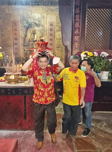 出巡前,蔡长镇与众理事陪同主宾即前任镇兴宫主席拿督斯里陈春华局绅,高举妈祖金身上轿,照足仪式出发。