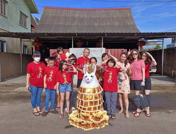 哥市唐人坡李家在金纸造型“金山玉兔”前来张全家福。(洪维聪摄影)