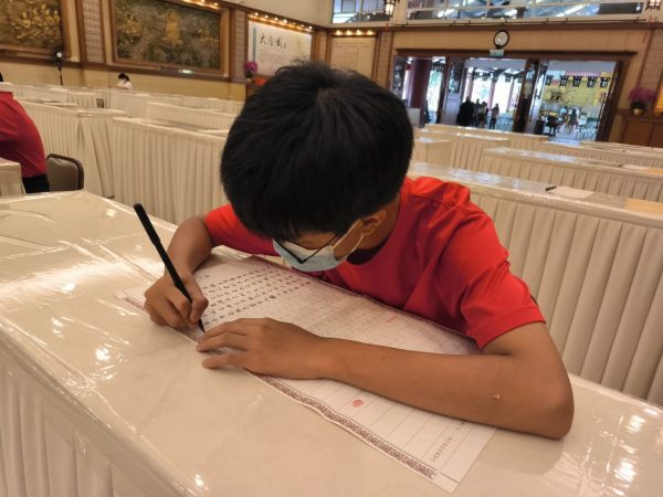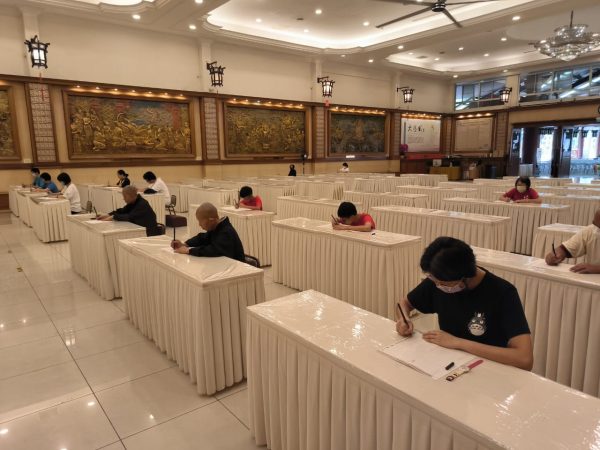信众完成弔唁和礼佛后,也可留下来殿内抄经,目前已有不少信众在抄经。