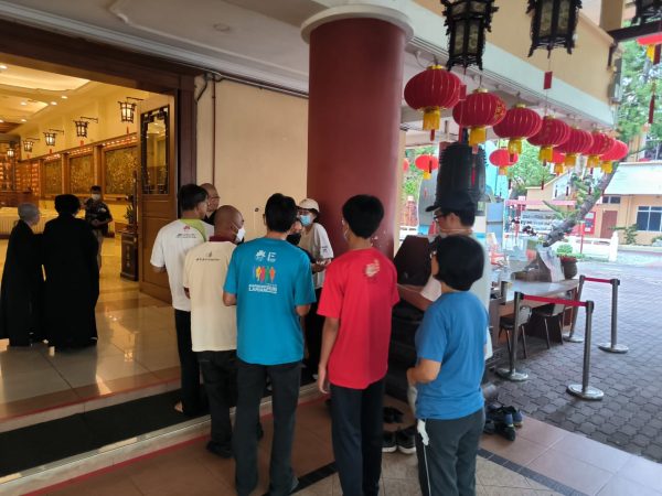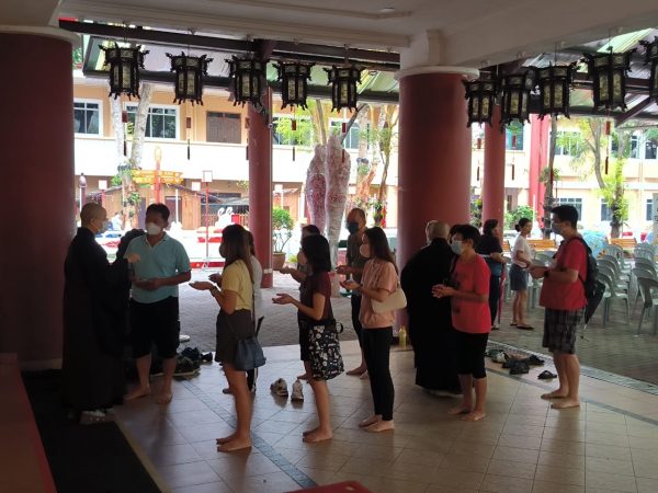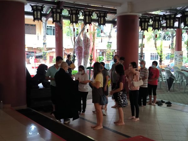 信众在约中午12时陆续排队弔唁。他们先在大雄宝殿外手捧着沉香木和兰花,然后再缓缓走进殿内,以向大师作最后敬意。