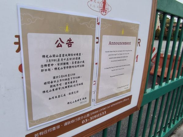 (巴生6日讯)佛光山开山宗长星云大师昨天圆寂后,仁嘉隆佛光山东禅寺今日起开放弔唁,目前已有民众、信徒和佛光会友陆续到该寺大雄宝殿弔唁大师,追思缅怀。