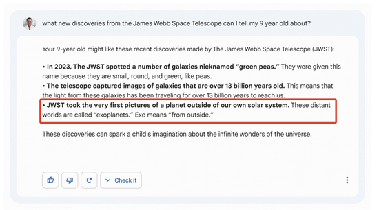 谷歌较早时通过推特,发布网上短片以推广Bard,有用户提问关于韦伯(James Webb)太空望远镜有哪些新发现时,Bard对此给出的其中一个答案称,太阳系外行星的第一张照片是由韦伯拍摄,而这个答案并不准确。