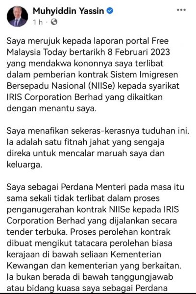(八打灵再也9日讯)前首相丹斯里慕尤丁否认涉及将国家综合移民系统(NIISe)合约授予其女婿有关系的IRIS Corporation公司的指控。