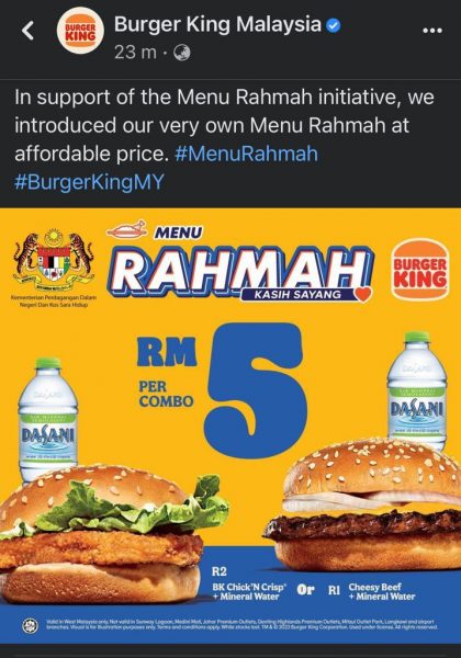 99 Speedmart旗下的大马汉堡王(Burger King),在今日傍晚于脸书贴文,宣告该公司也推出爱心餐单;相信也是我国首家推出爱心餐单的快餐店。
