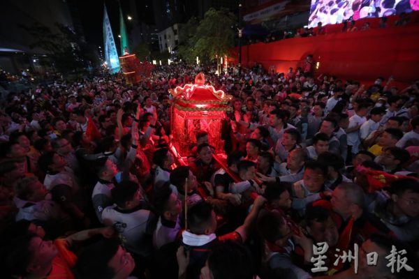 与此同时,护轿者不时大力摇晃神轿,熟悉的“兴啊!发啊”呐喊声此起彼落,代表新山五帮各自会馆颜色的游神服,则形成另一道亮丽的风景线。