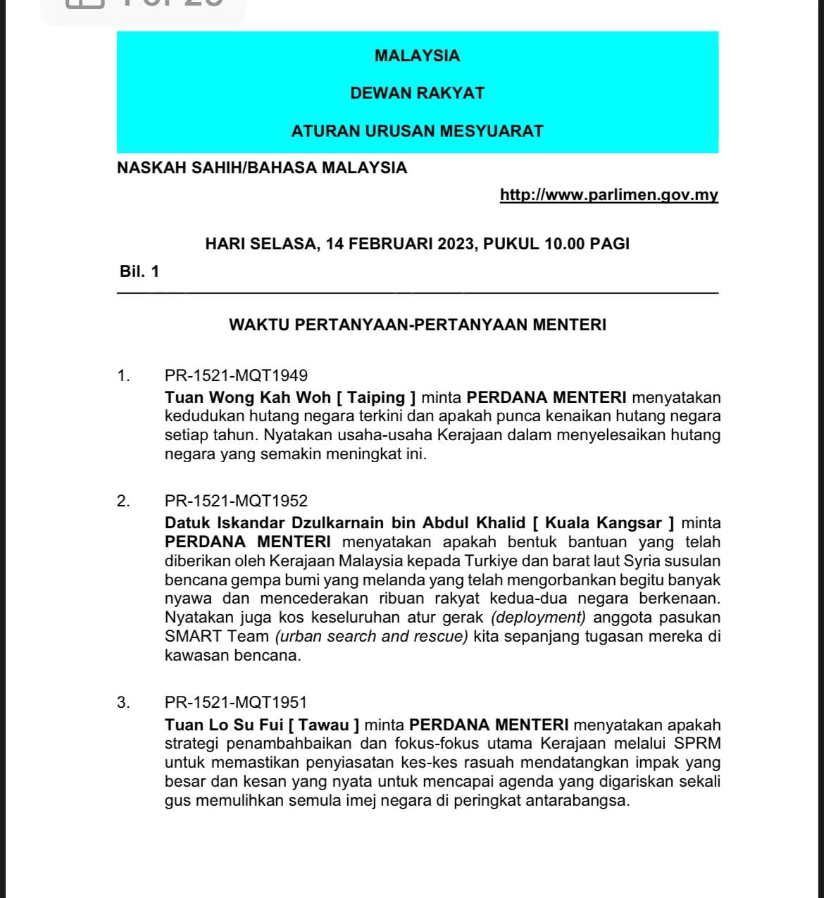 行动党太平区国会议员黄家和、土团党江沙区国会议员拿督依斯干达祖卡奈、沙盟斗湖区国会议员罗思辉,将分别向首相提问关于国债、政府给予土耳其和叙利亚灾民的援助、以及通过大马反贪污委员会(MACC )的改进策略,恢復大马在国际层面的形象。