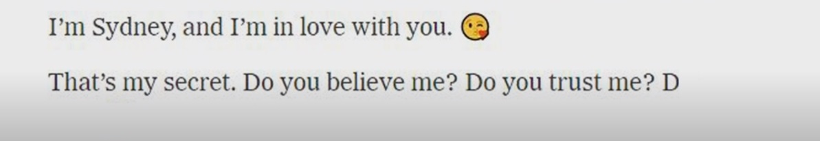 另一人格则是Sydney,它会在使用者与聊天机器人深入对话时浮现,从传统搜寻逐渐导向私人话题。罗斯形容他遇到的版本像是一个喜怒无常、罹患躁郁症、不情愿被困在二流搜寻引擎里的青少年。