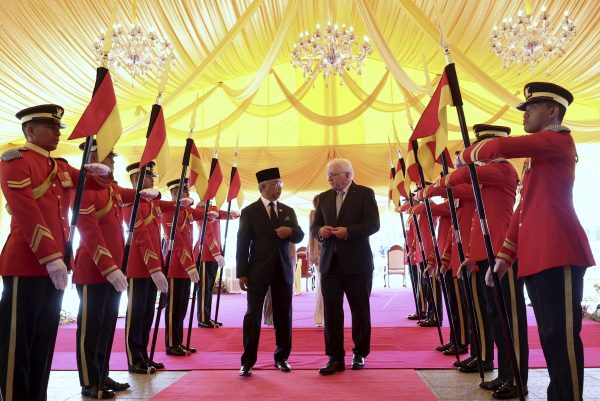 施泰因迈尔与夫人埃尔克是于今早10时抵达仪式会场,并由国家元首苏丹阿都拉和元首后东姑阿兹莎亲自迎接。