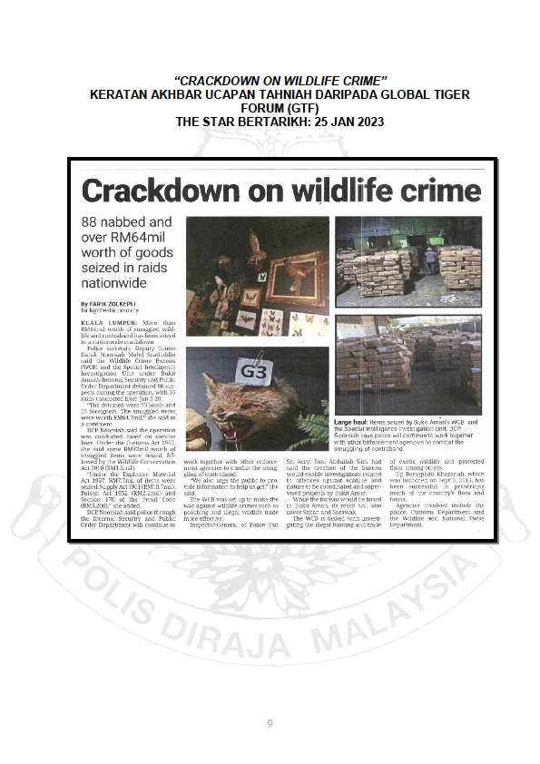 另一方面,诺西亚指出,警方野生动物犯罪局(WCB)与警方情报和特别调查小组(PSK)去年积极展开“国家财产保护行动”(OBK),全年内侦破23宗案件,扣押总值268万7370令吉的各类动物。